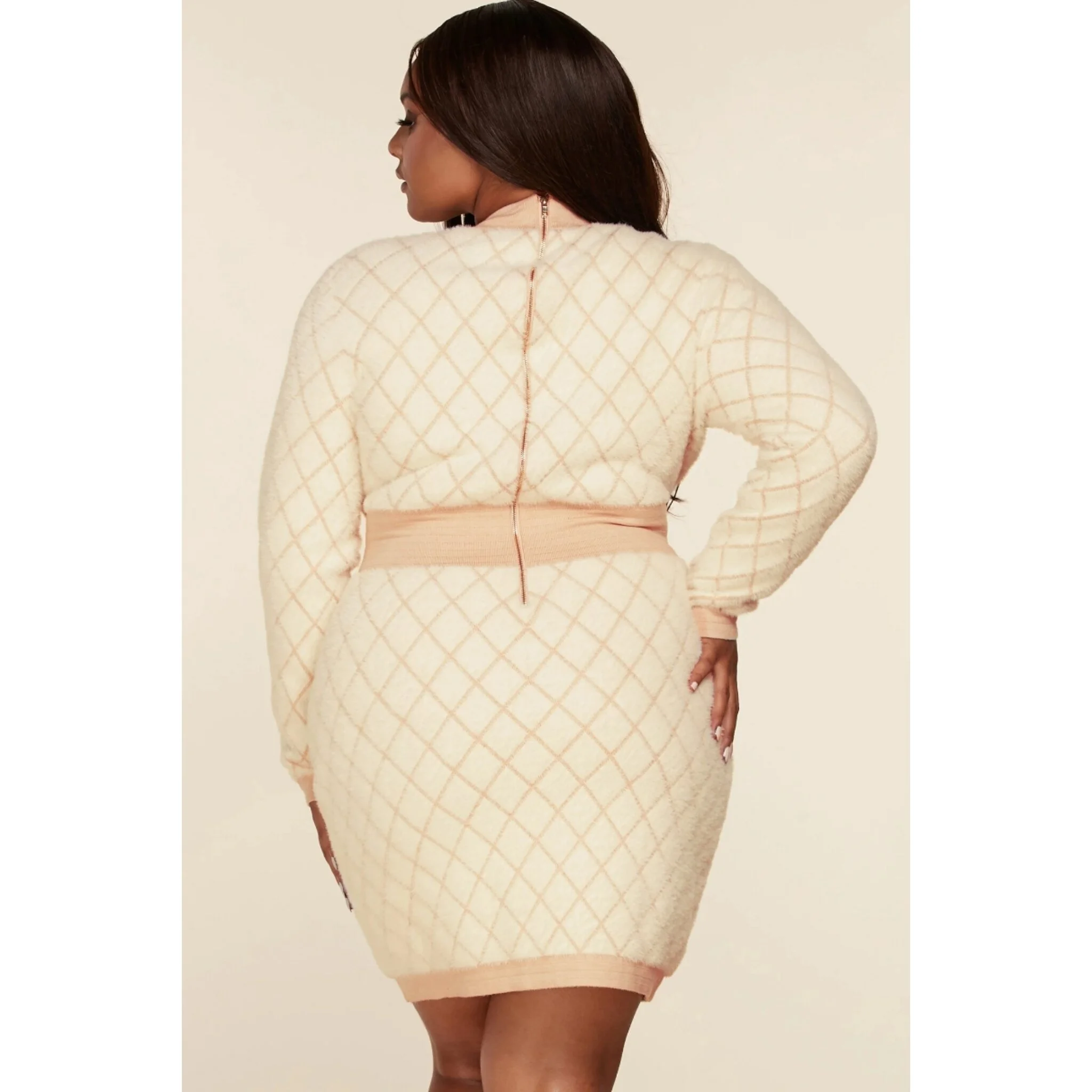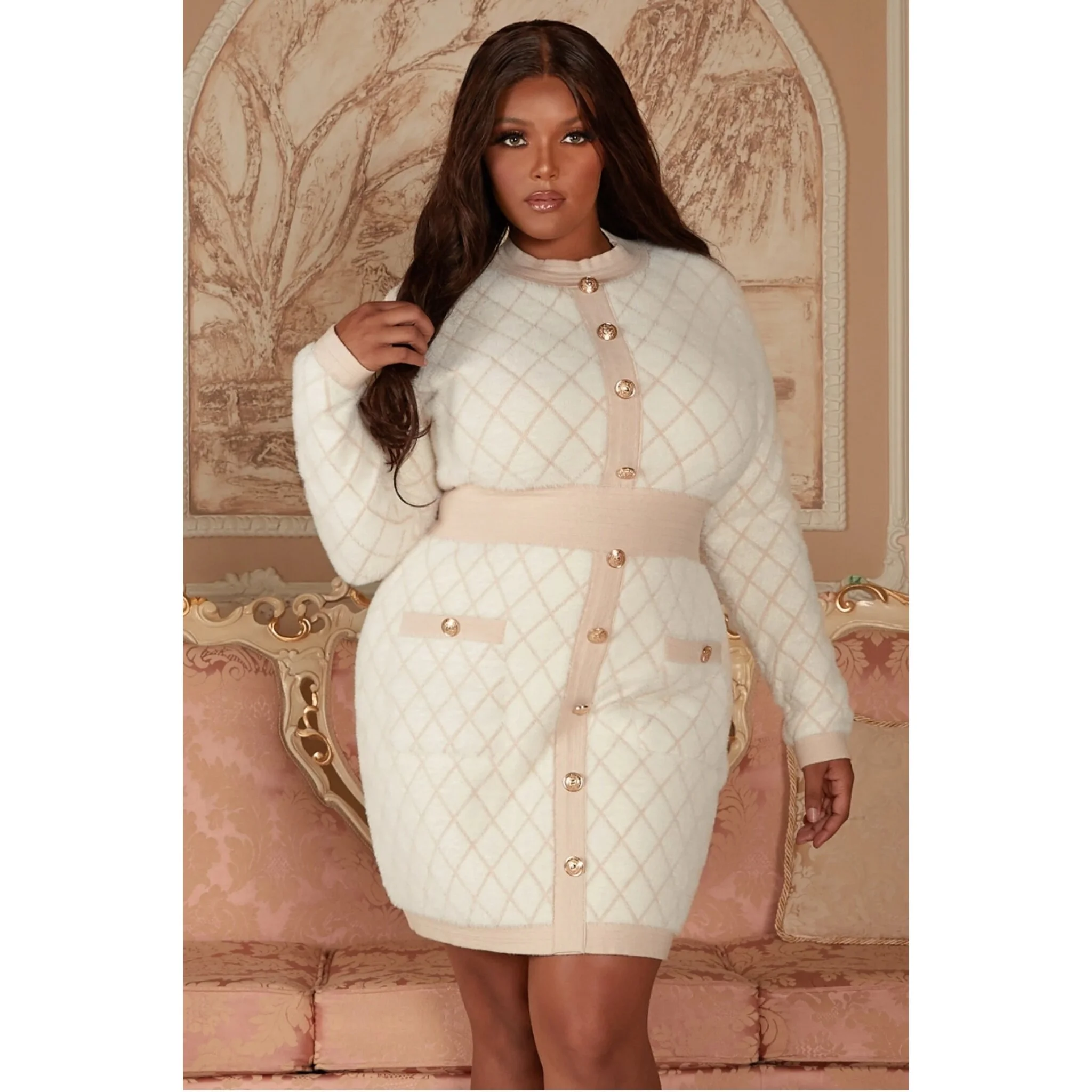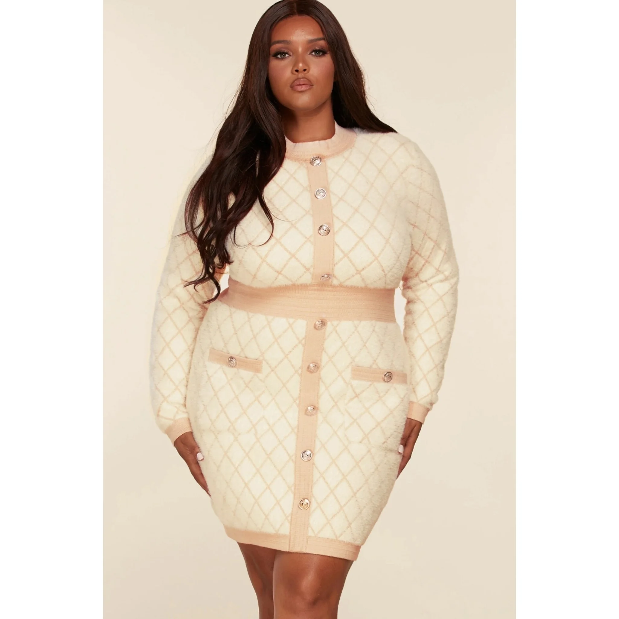 Quilted pattern fuzzy knit bodycon mini dress. Features contrast solid details at the highneck, fitted waist, and it the hem. Decorative embossed buttons down the front and patch pickets.