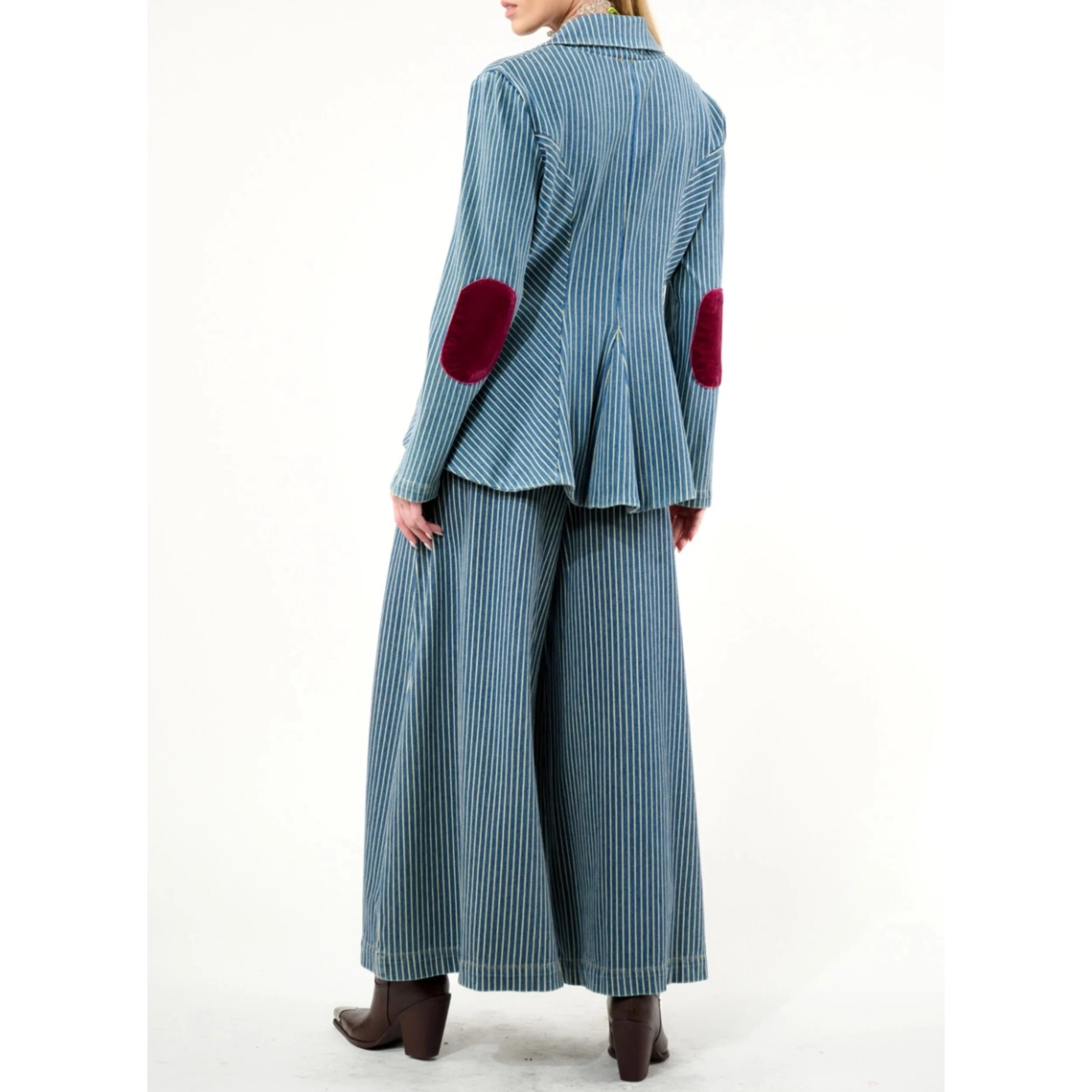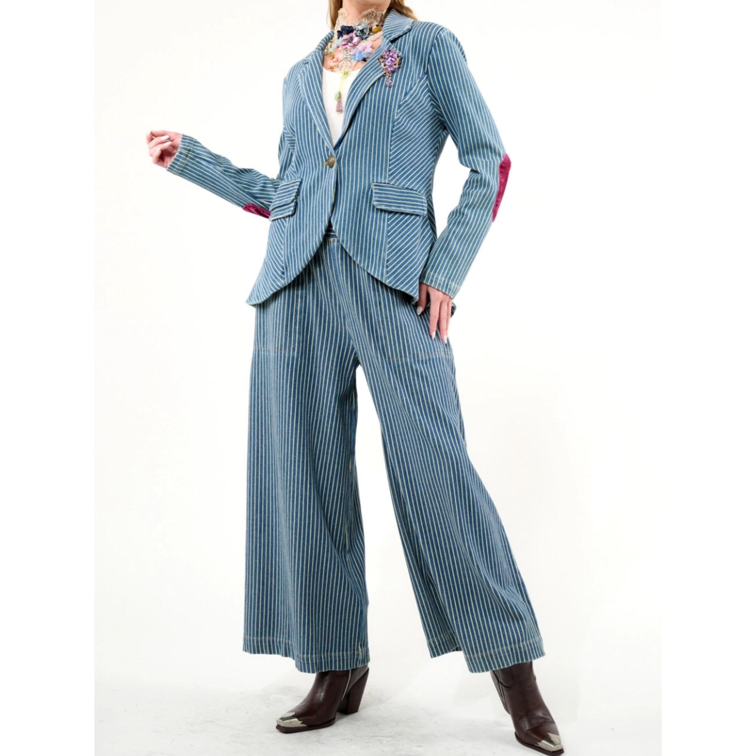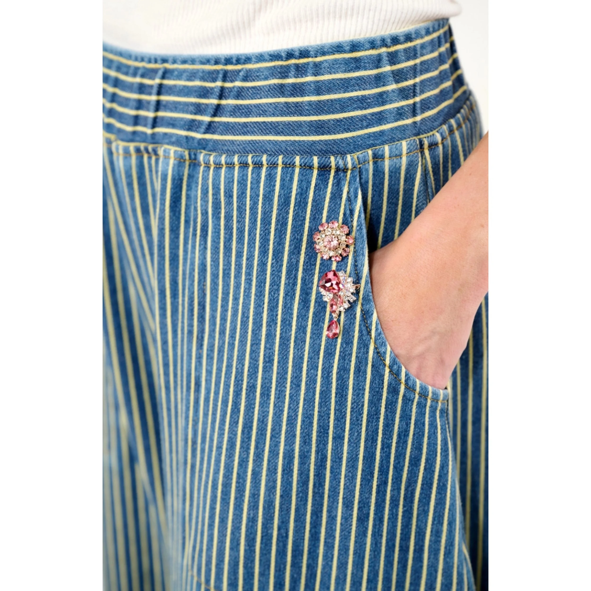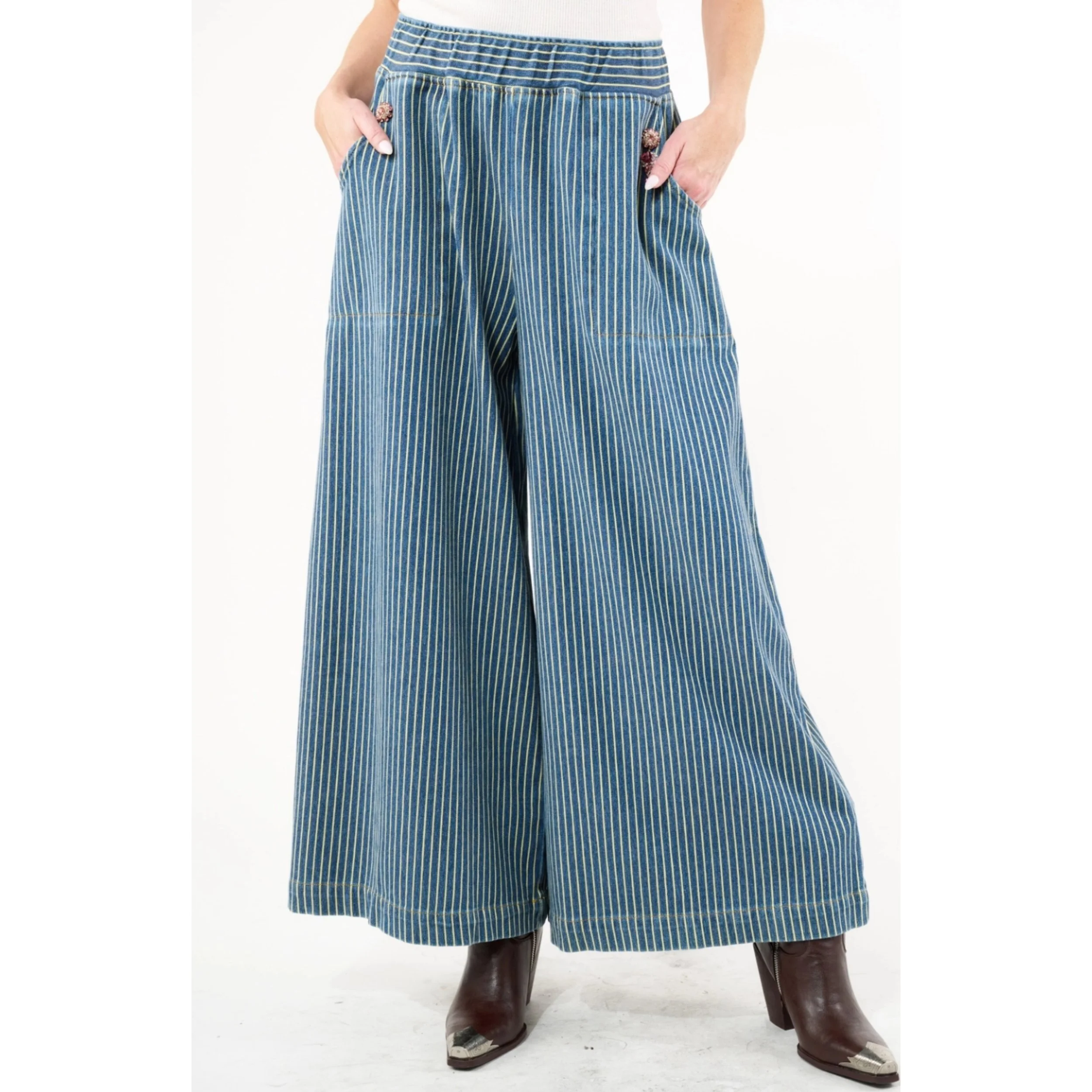Stripe denim elastic waist wide leg pants with crystal buttons/pin attached to the top of the pockets.